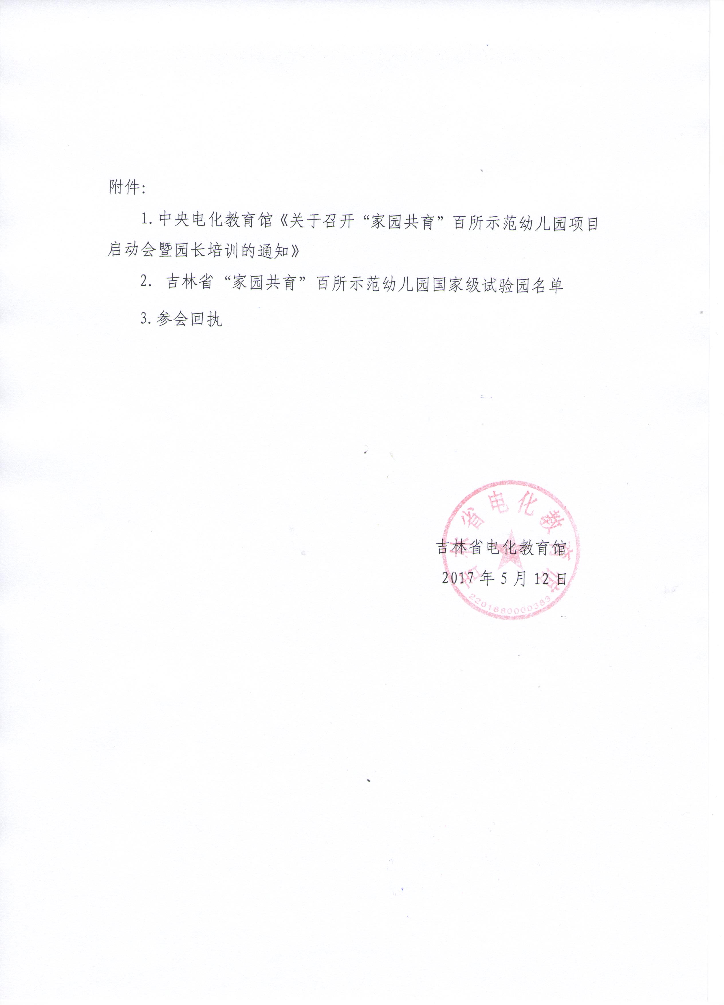 关于公布吉林省“家园共育”百所示范幼儿园国家级试验园名单及转发中央电化教育馆《关于召开“家园共育”百所示范幼儿园项目启动会暨园长培训的通知》