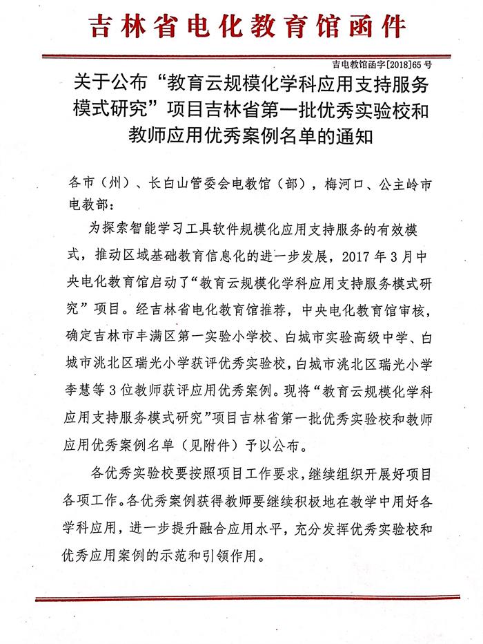关于公布“教育云规模化学科应用支持服务模式研究”项目吉林省第一批优秀实验校和教师应用优秀案例名单的通知