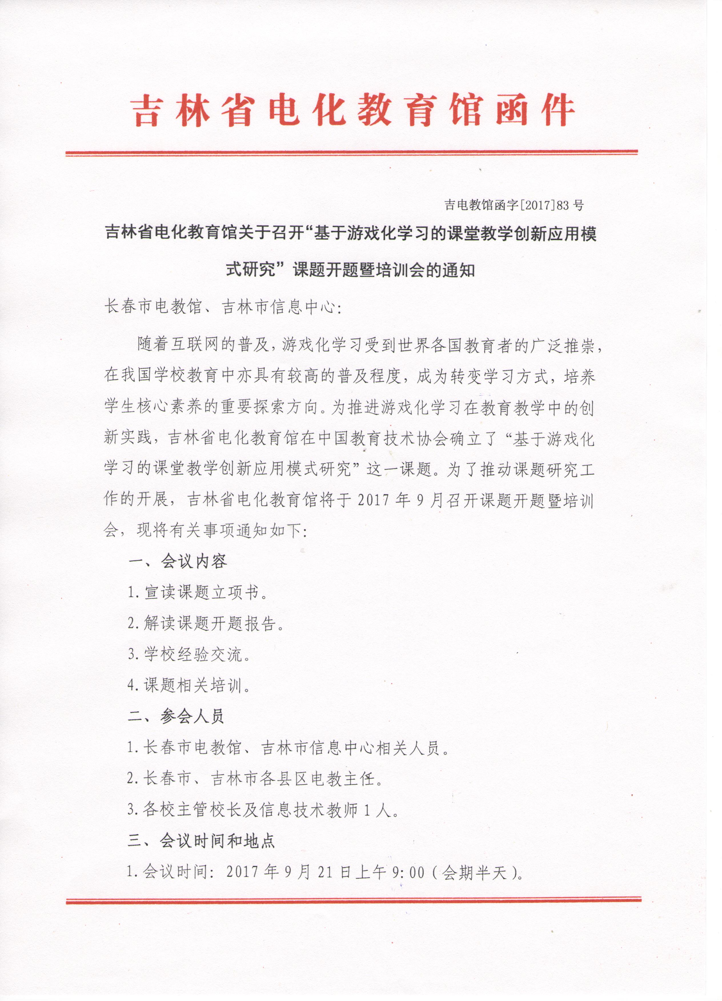 吉林省电化教育馆关于召开“基于游戏化学习的课堂教学创新应用模式研究”课题开题暨培训会的通知