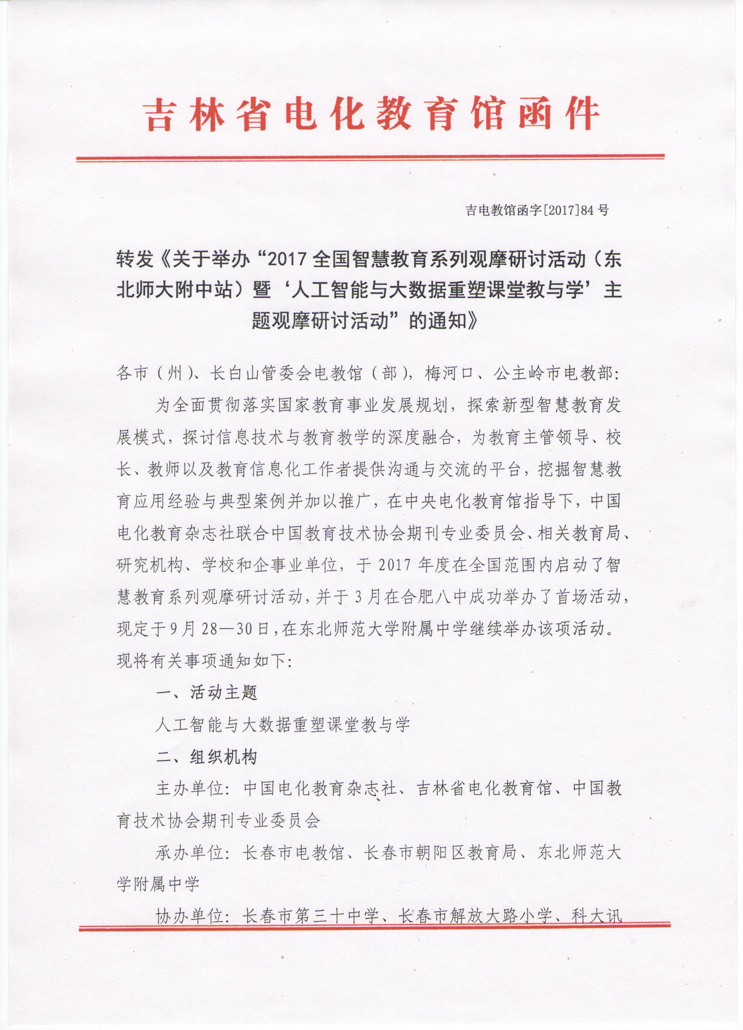 转发《关于举办“2017全国智慧教育系列观摩研讨活动(东北师大附中站)暨‘人工智能与大数据重塑课堂教与学’主题观摩研讨活动”的通知》