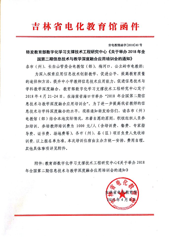 转发教育部数字化学习支撑技术工程研究中心《关于举办2018年全国第二期信息技术与教学深度融合应用培训会的通知》