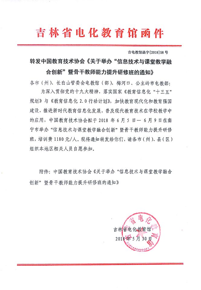转发中国教育技术协会《关于举办“信息技术与课堂教学融合创新”暨骨干教师能力提升研修班的通知》