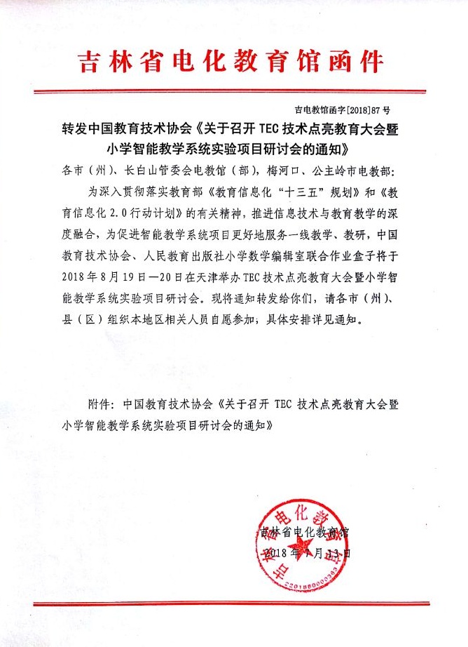 转发中国教育技术协会《关于召开TEC技术点亮教育大会暨小学智能教学系统实验项目研讨会的通知》