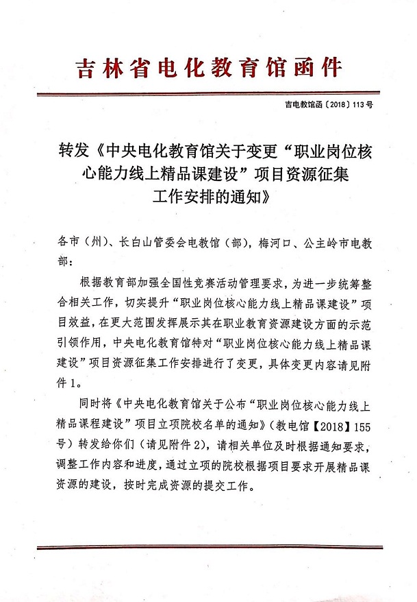 转发《中央电化教育馆关于变更“职业岗位核心能力线上精品课建设”项目资源征集工作安排的通知》
