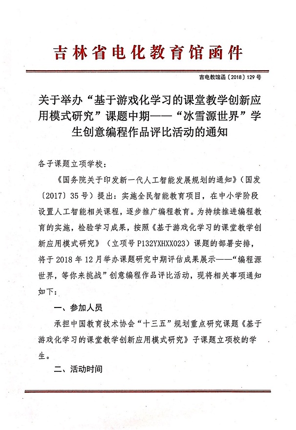 关于举办“基于游戏化学习的课堂教学创新应用模式研究”课题中期——“冰雪源世界”学生创意编程作品评比活动的通知