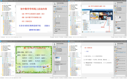 例如:在活动1和活动2中,通过YY平台上网上研修活动使学员们明白了YY平台的使用与操作,确定了数学学科研修方案,明确了后面的具体任务。