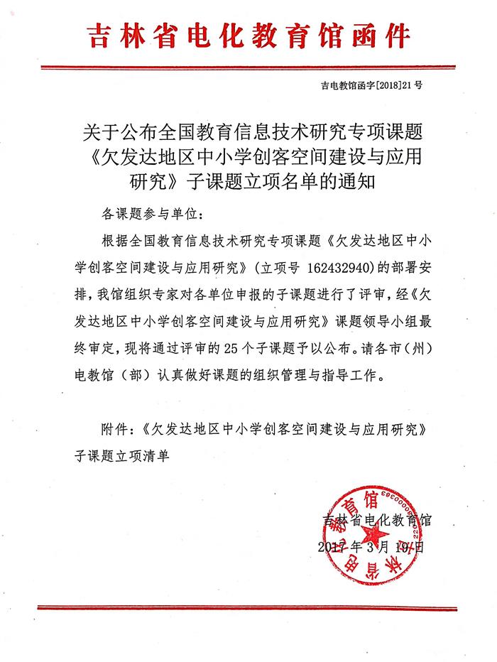 关于公布全国教育信息技术研究专项课题《欠发达地区中小学创客空间建设与应用研究》子课题立项名单的通知