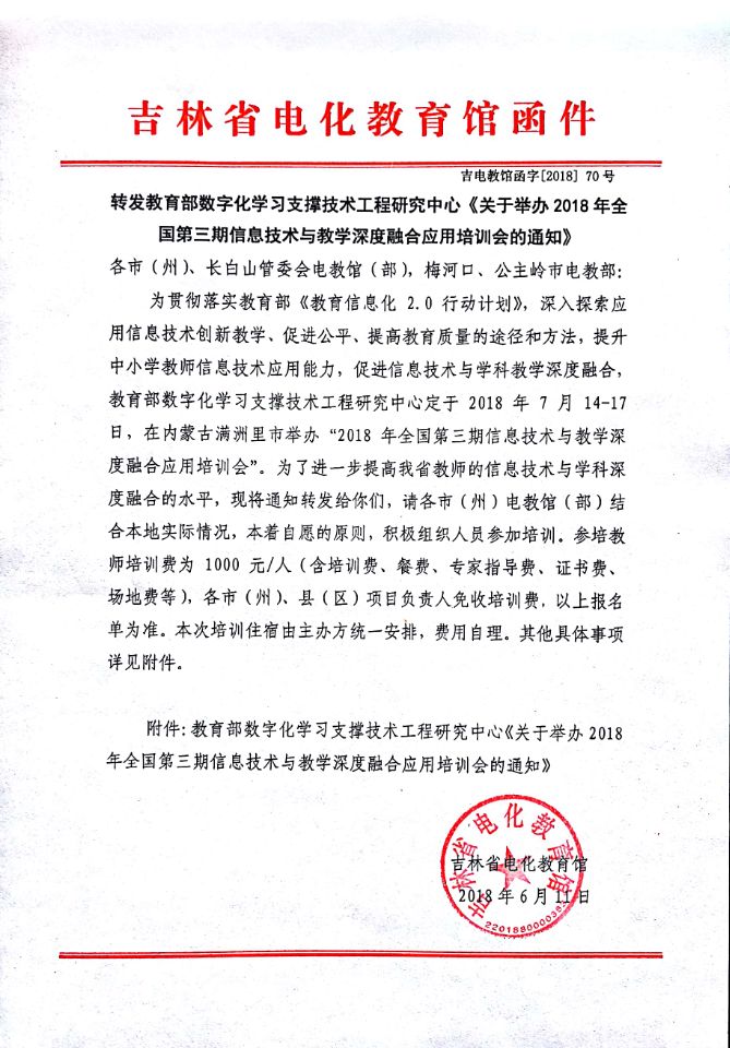 转发教育部数字化学习支撑技术工程研究中心《关于举办2018年全国第三期信息技术与教学深度融合应用培训会的通知》