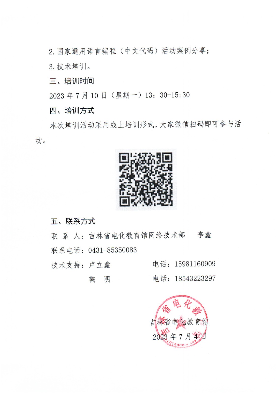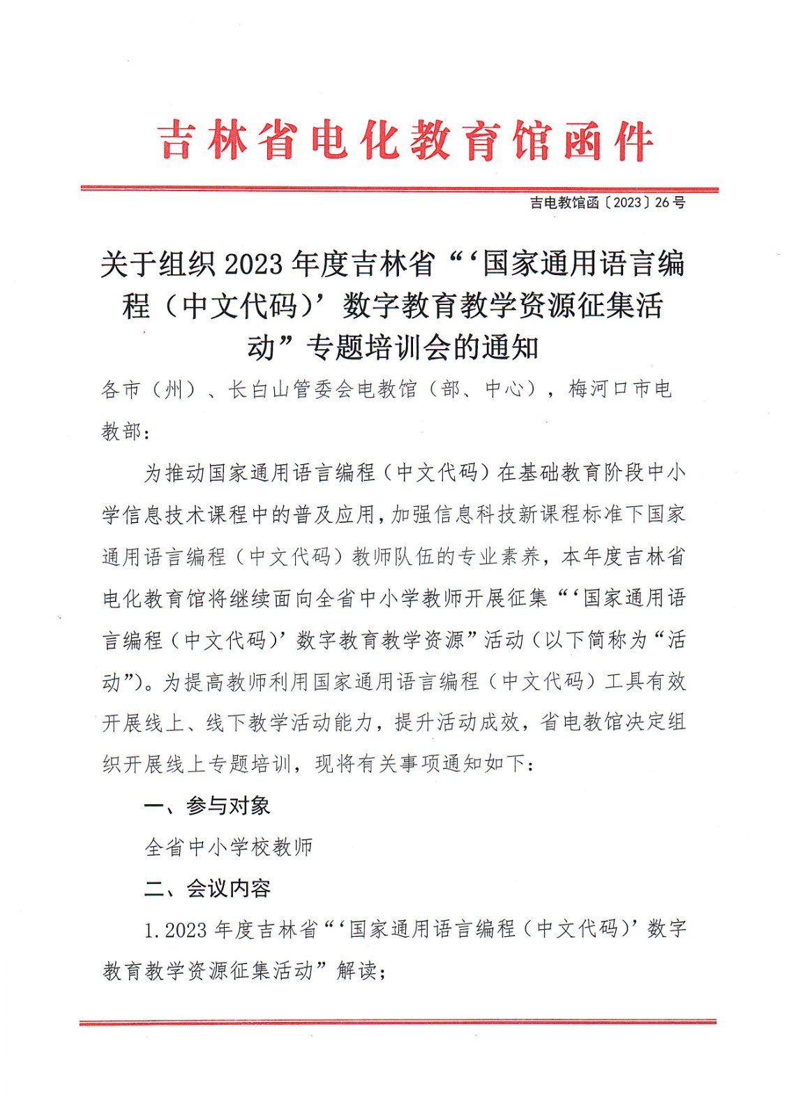 关于组织2023年度吉林省“‘国家通用语言编程(中文代码)’数字教育教学资源征集活动”专题培训会的通知